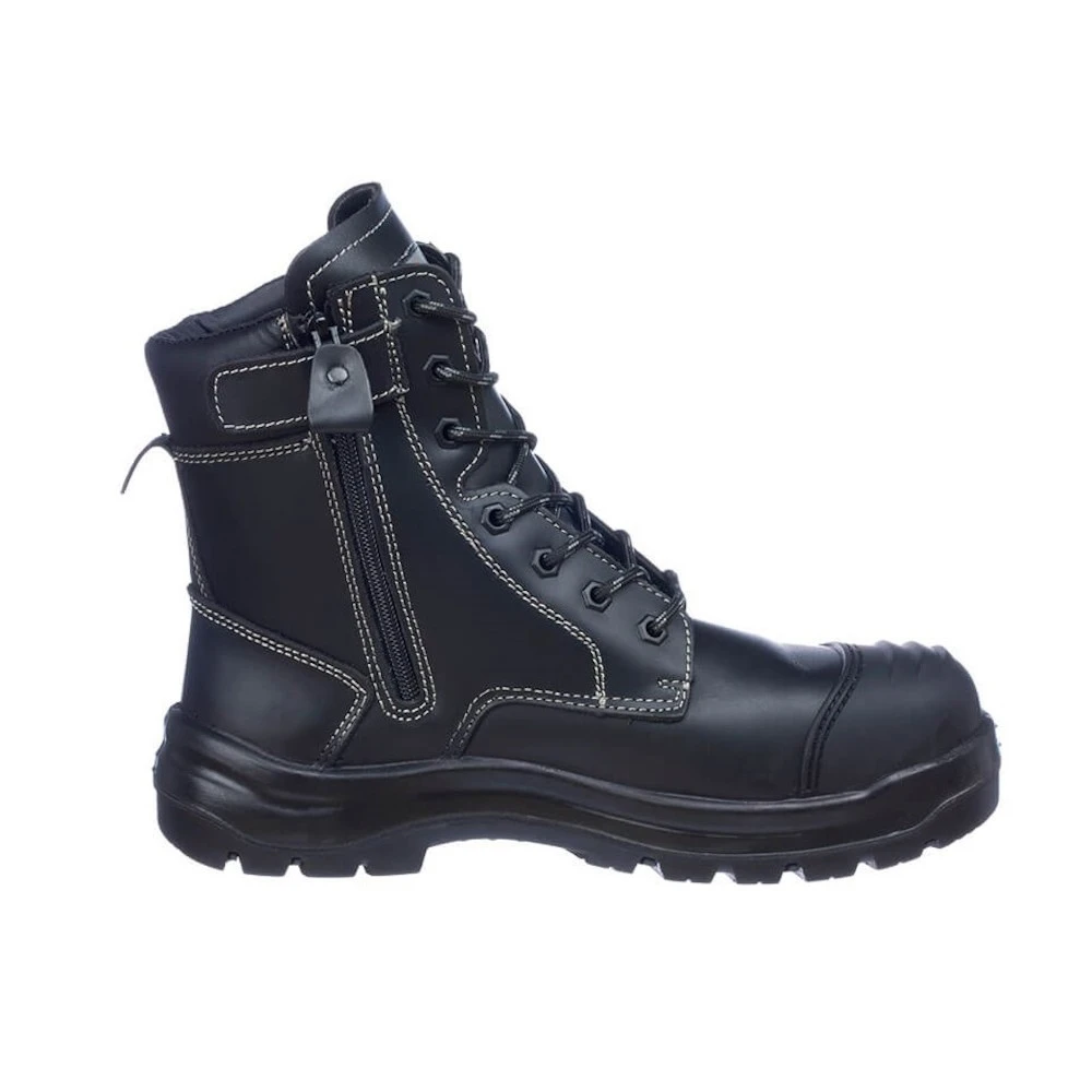 Complete protection, the full grain leather upper provides a barrier to all weather conditions. High lace up style with a robust zip for a comfortable fit and reliable support in rugged environments. Injected PU/rubber outsole for supreme grip and energy absorption.